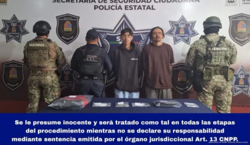 Cancún, Quintana Roo.— Dos hombres fueron detenidos en el fraccionamiento Villas Otoch, en el municipio de Benito Juárez, tras ser sorprendidos presuntamente intercambiando bolsitas con droga durante un operativo de vigilancia.