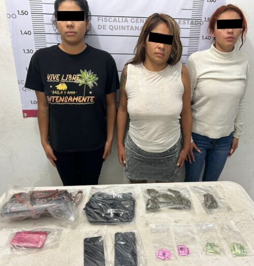 En una primera acción, Emma Marina “N”, Sofía “N” y Laura Angélica “N”, fueron detenidas en flagrancia sobre la calle Sol Poniente, a la altura de la calle Júpiter Sur; los agentes les aseguraron los estupefacientes denominados marihuana, cristal, cocaína y dos teléfonos celulares.