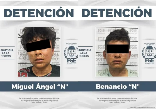 Puerto Morelos.— Dos hombres identificados como Miguel Ángel “N” y Benancio “N” fueron detenidos en Puerto Morelos por su presunta participación en delitos contra la salud en su modalidad de narcomenudeo, además de portación de armas de fuego de uso exclusivo y homicidio en grado de tentativa, luego de un enfrentamiento armado registrado sobre la carretera federal Cancún–Playa del Carmen.