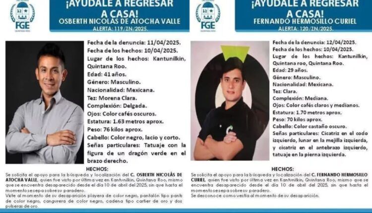 Kantunilkin.- Luego de ser reportadas por sus familiares como desaparecidas, la Fiscalía General del Estado de Quintana Roo activó las fichas de búqueda de Fernando Hermosillo Curiel y de Osberth Nicolás de Atocha Valle, quienes acudieron a esta cabecera municipal por motivos de trabajo y no han retornado a sus hogares desde el pasado 10 de abril.