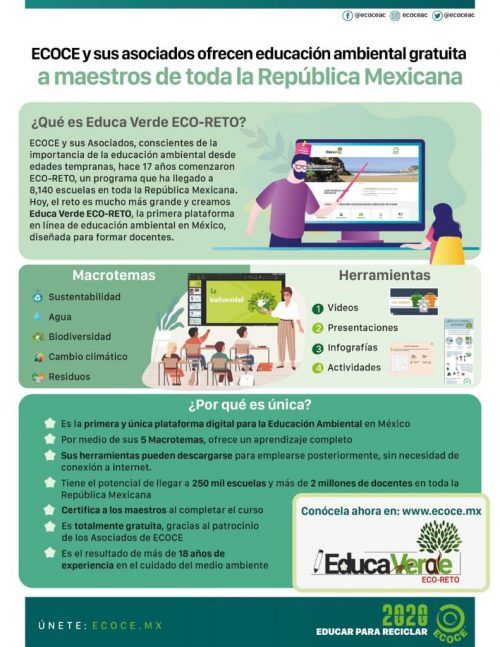 ‘Educa Verde ECO-RETO’ es una plataforma gratuita, única y creada para dar una educación veraz y de calidad a maestros y alumnos. Sin embargo, los tiempos requieren mayor apertura, por ello está disponible para toda persona con deseos de aprender y capacitarse. Conócela en: www.ecoce.mx/educa_verde