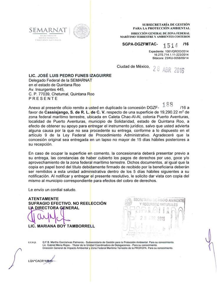 La empresa fue creada ex profeso para obtener la Zofemat. La empresa Cassis Jango fue constituida en mayo de 2014, y la concesión que la Semarnat la obtuvieron en abril de 2016, pues la Semarnat le otorgó a la empresa CassisJango S. de R.L. de C.V. la concesión de la Zona Federal Marítima Terrestre para la explotación de casi 19 mil 290.22 metros cuadrados de la caleta Chac Hal Al, según el documento con número de expediente 1081/QROO/2014 de la Semarnat.
