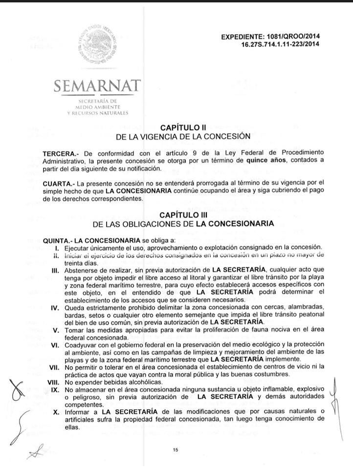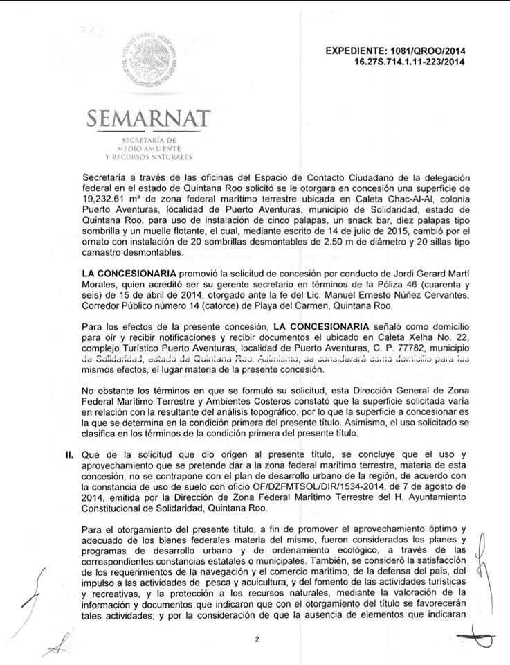 El entonces delegado de Semarnat en Quintana Roo, Jose Luis Pedro Funes Izaguirre, le otorgó la concesión para la instalación de cinco palapas, un snack bar, diez palapas tipo sombrilla y un muelle flotante, el cual, mediante escrito de 14 de julio de 2015, cambió por el ornato con instalación de 20 sombrillas desmontables de 2.50 metros de diámetro y 20 sillas tipo camastro desmontables.