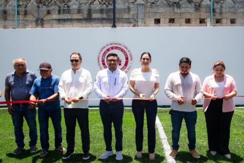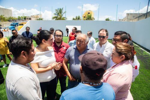 Playa del Carmen.— La presidenta municipal Estefanía Mercado encabezó la inauguración de una cancha de fútbol 7 y otra de básquetbol en el emblemático Sindicato de Volqueteros “José Quiam Chan”, uno de los más antiguos de Playa del Carmen y símbolo del trabajo colectivo que hoy se suma a la construcción de paz y prosperidad que encabeza su gobierno.