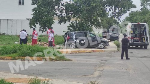 Playa del Carmen, 3 de septiembre de 2021.- Una conductora salvó milagrosamente la vida al salir por propio pie de su vehículo volcado, luego de que fuera chocada por una patrulla de Seguridad Pública Municipal sobre el camino al relleno sanitario o basurero local.