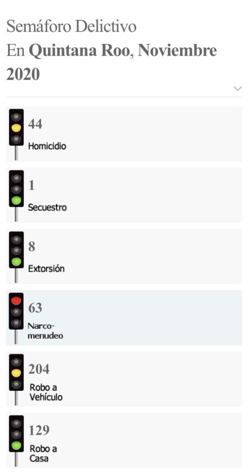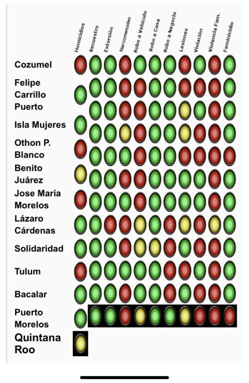 En el semáforo delictivo nacional, Quintana Roo se ubica en color verde en robo a negocios y casas habtación, y en color amarillo respecto a homicidios dolosos.