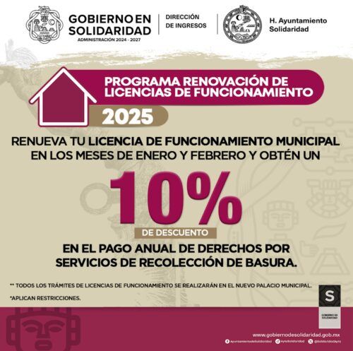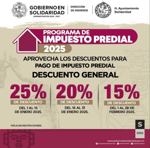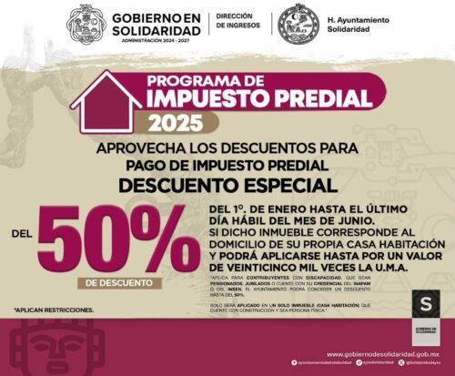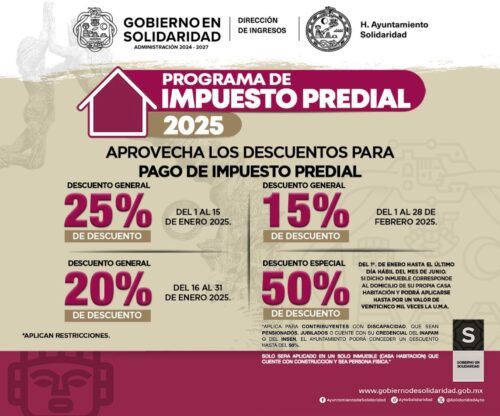 Por último, pidió a la ciudadanía consultar los descuentos, restricciones y sedes para realizar los pagos en la página y las redes sociales oficiales del Ayuntamiento de Solidaridad.