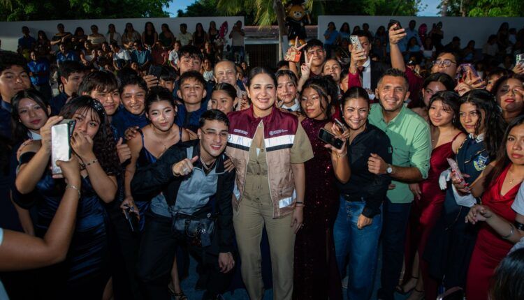 Playa del Carmen.— La presidenta municipal Estefanía Mercado, y el reguetonero mexicano El Malilla, se unieron este jueves para reconocer y felicitar a los estudiantes de la secundaria “José España Cruz”, en la colonia Colosio, quienes celebraron su ceremonia de graduación horas antes del concierto del artista en la Plaza 28 de Julio.