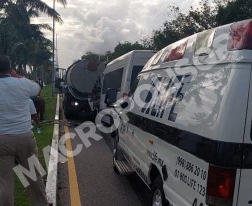 Cancún, a 24 de mayo de 2021.- La Policía Turística de Cancún acudió a dar asistencia en un aparatoso accidente vehicular en el kilómetro 26 de la Zona Hotelera de Cancún, entre una pipa de agua contra un particular en donde se encontraba una persona prensada.