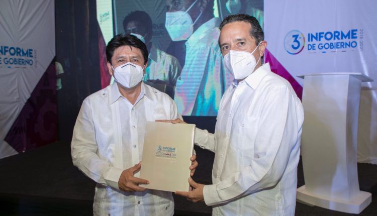 Tulum, Quintana Roo a 13 de septiembre de 2021.- El presidente Municipal de Tulum, Víctor Mas Tah, rindió el tercer informe de gobierno de la administración del Ayuntamiento de Tulum 2018-2021, acompañado por el gobernador del estado, Carlos Joaquín González y los regidores integrantes del cabildo, donde destacó el crecimiento del municipio en el rubro de infraestructura, servicios públicos y desarrollo económico mediante el trabajo conjunto con la