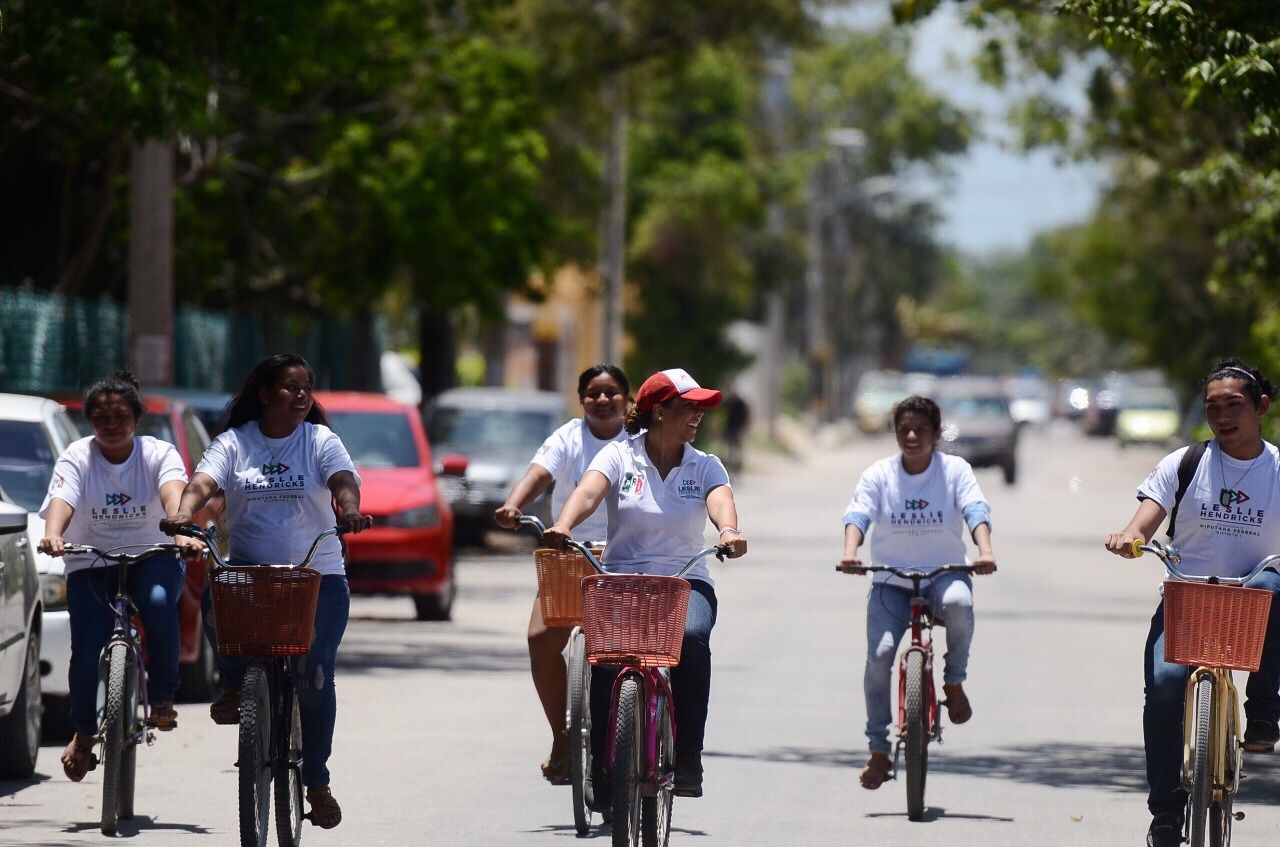 Tulum, Q. Roo, 19 de Abril 2018.- Leslie Hendricks Rubio, candidata de la Coalición Todos por México a la diputación federal por el Distrito 01, reconoció el cuidado al medio ambiente en este municipio, en el que parte de la población utiliza energías alternas para su vida cotidiana o para servicios turísticos y hace del uso de la bicicleta el medio de transporte ideal.