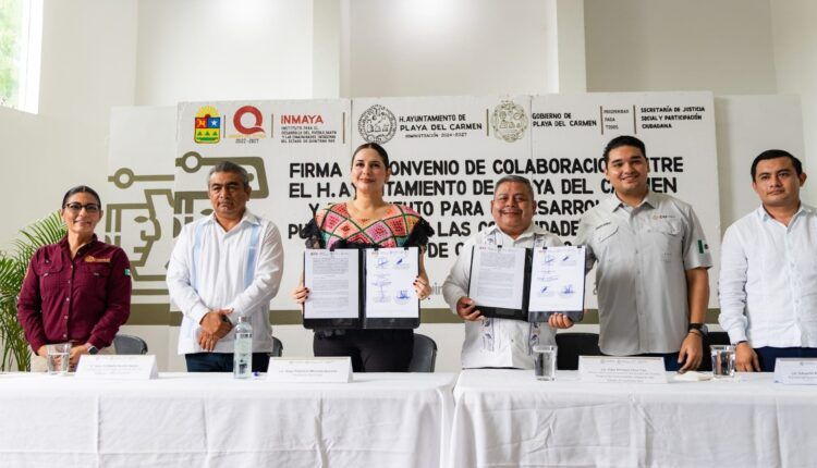 Playa del Carmen.— La presidenta municipal Estefanía Mercado encabezó esta mañana la firma del convenio de colaboración entre el Ayuntamiento de Playa del Carmen y el Instituto para el Desarrollo del Pueblo Maya y las Comunidades Indígenas de Quintana Roo (INMAYA), representado por Eder Chuc Cen.