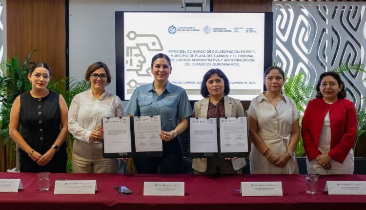 Playa del Carmen.- La alcaldesa Estefanía Mercado y la magistrada presidenta del Tribunal de Justicia Administrativa y Anticorrupción del Estado de Quintana Roo, Minerva Maribel Moreno Cruz, firmaron hoy un convenio de colaboración, con el objetivo de brindar las garantías de acceso a la justicia y una adecuada defensa de los procedimientos de responsabilidad administrativa por parte de servidores públicos.