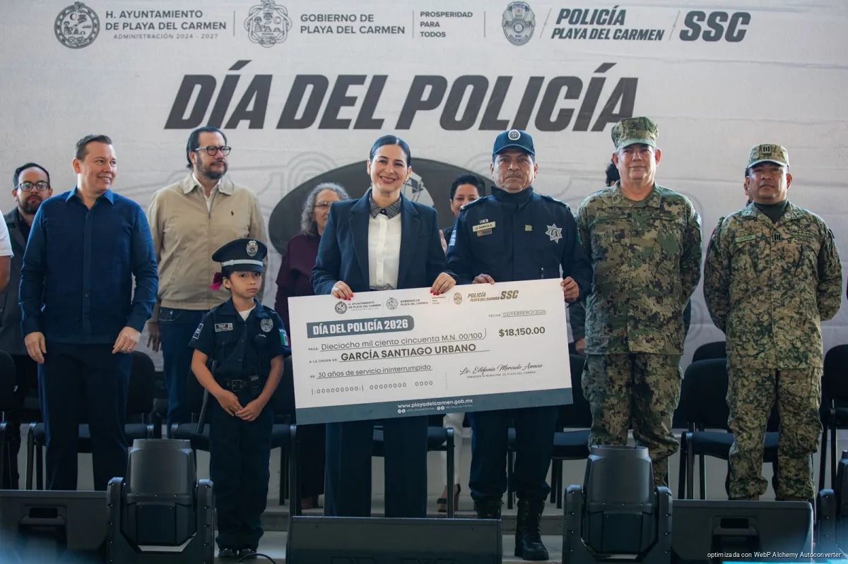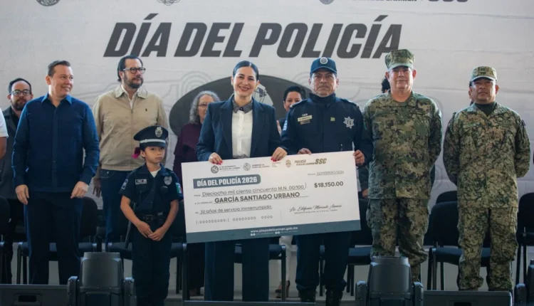 En el marco de la conmemoración del Día del Policía, la presidenta municipal Estefanía Mercado reconoció la vocación, disciplina y valentía de las mujeres y hombres que integran la Secretaría Municipal de Seguridad Ciudadana de Playa del Carmen (SSCM), a quienes entregó bonos y estímulos económicos por 10, 15, 20, 25 y 30 años de servicio.