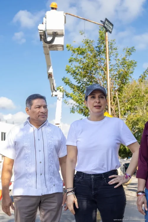 Acompañada por la secretaria de Servicios Públicos, Julieta Martín Azueta, y el alcalde Gilberto Gómez Martínez, la presidenta municipal recorrió la calzada Puerto Maya, donde cuadrillas del área de Alumbrado Público realizaron mantenimiento y sustitución de luminarias.