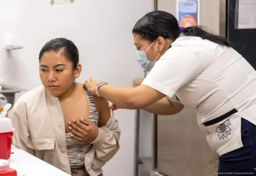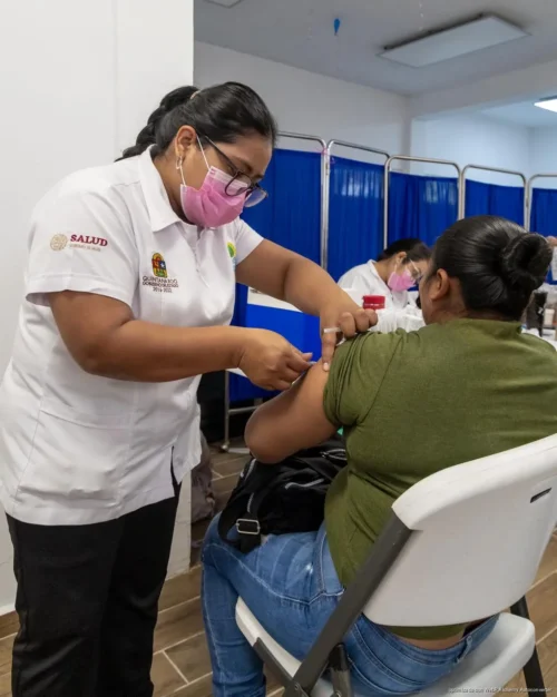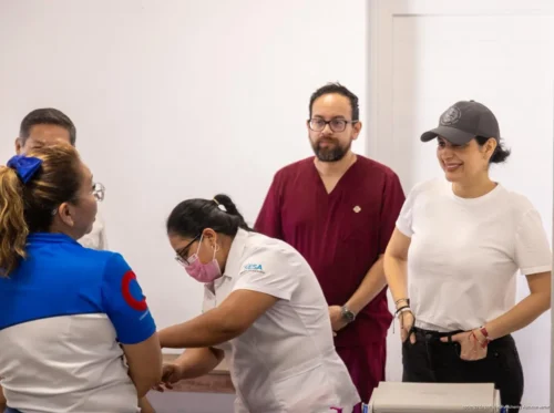 Previo a la supervisión de obras, la presidenta municipal visitó el Centro de Salud de Puerto Aventuras, acompañada por el alcalde y el secretario de Salud, José Antonio Uribe, donde se llevó a cabo una jornada de vacunación contra el sarampión.