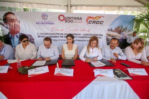 Playa del Carmen.- Con el firme compromiso por la educación, capacitación y el buen servicio, la Confederación Revolucionaria de Obreros y Campesinos (CROC) y el H. Ayuntamiento de Solidaridad llevaron a cabo la firma del Comodato y la colocación de la primera piedra para la construcción del Instituto Tecnológico Gastronómico y Hotelero, el cual será el primero en Latinoamérica.