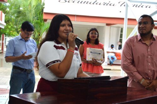 Playa del Carmen.- Con el objetivo de fortalecer la cultura libre de violencia y promover valores de respeto, sana convivencia y participación democrática entre la comunidad estudiantil, el Gobierno de Playa del Carmen, que encabeza la presidenta municipal Estefanía Mercado llevó a cabo una jornada cívico-educativa en la Escuela Secundaria Técnica No. 37 “René Efraín Fajardo”.