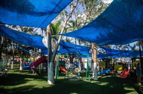 Por la presencia constante de aves en este espacio, dado que se trata de una zona arbolada, hubo necesidad de colocar lonas de protección debajo de las copas de los árboles de modo que quienes visitan la zona al igual que a los aparatos que constituyen la diversión de los menores no se vean afectados, y por ello, de forma constante requieren de limpieza y mantenimiento, señaló el director de Servicios Públicos Municipales, Adrián Manzanilla Lagos.