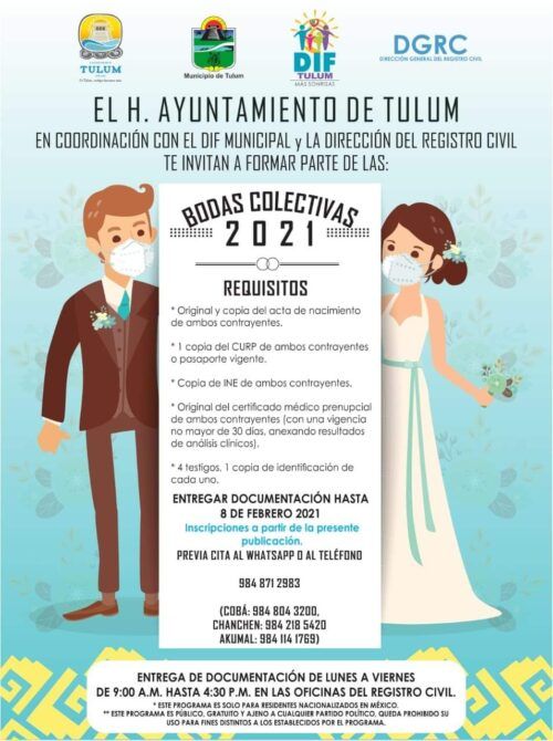 Tulum, Quintana Roo, 26 de enero de 2021.- El Ayuntamiento de Tulum, el Sistema para el Desarrollo Integral de la Familia (DIF) y la Dirección General del Registro Civil, invitan a las parejas que deseen formalizar su matrimonio, a participar en el programa “Bodas Colectivas 2021”, celebración que se lleva a cabo cada 14 de febrero de manera gratuita, pero que este año no tendrá ceremonia social debido a las restricciones que establece el semáforo epidemiológico.