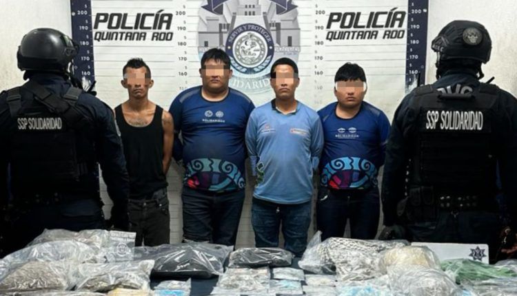Playa del Carmen.- Policías Municipales de Solidaridad aseguraron a 4 sujetos, un arma de fuego, 31 cartuchos útiles y 342 envoltorios con posibles narcóticos, tras dar respuesta inmediata a un llamado de emergencia al 9-1-1.