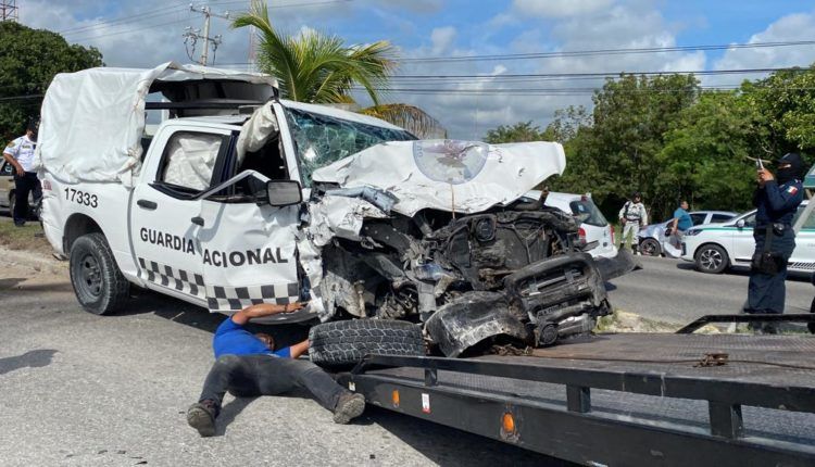 Cancún.- Un vehículo de la Guardia Nacional comisionado en este destino turístico protagonizó un aparatoso accidente, al impactar a una camioneta que transportaba productos cárnicos sobre el bulevar Luis Donaldo Colosio de Cancún.