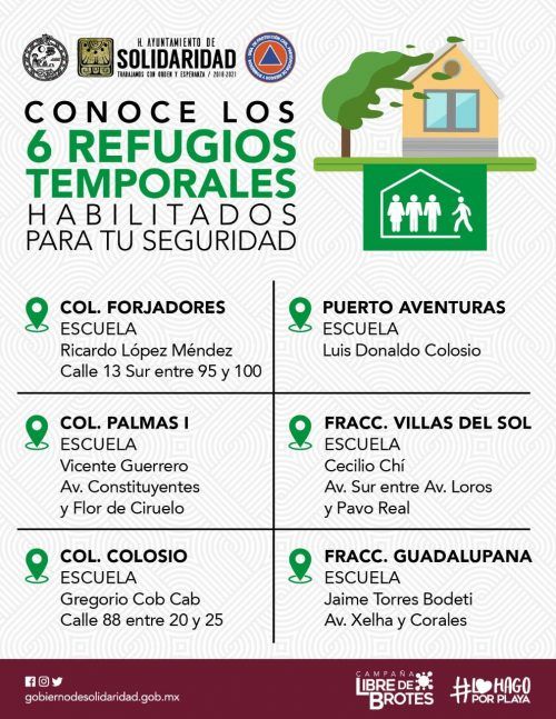 Los refugios se encuentran en las siguientes escuelas: Ricardo López Méndez, en la calle 13 sur entre 95 y 100 en la colonia Forjadores; Vicente Guerrero, en la avenida Constituyentes y calle Flor de Ciruelo en el fraccionamiento Palmas 1; Gregoria Cob Cob, en la calle 88 entre avenidas 20 y 25 en la colonia Colosio; Cecilio Chí, en la avenida Sur entre avenidas Loros y Pavorreal, en el fraccionamiento Villas del Sol; Jaime Torres Bodet, en la avenida Xel-Há y Corales, en el fraccionamiento Villas del Sol; y la escuela Luis Donaldo Colosio en Puerto Aventuras.