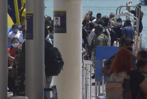 Cancún, Quintana Roo, 16 de abril del 2021.- Sujetos que pretendían cruzar hacia Isla Mujeres en el ferry de Ultramar en la Supermanzana 85 acudieron al sitio para comprar sus pases de abordar; sin embargo, se negaron a ser revisados por personal de seguridad de la terminal marítima.