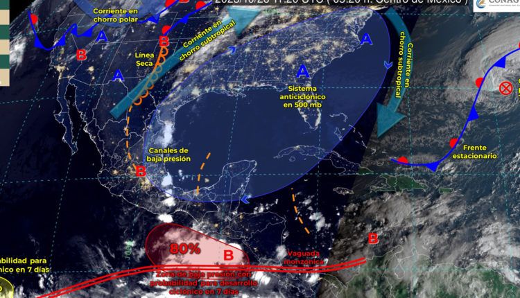 Finalmente, una zona de baja presión con probabilidad para desarrollo ciclónico se desplazará frente a las costas de Guatemala, sus desprendimientos nubosos reforzarán la probabilidad de lluvias intensas en Chiapas. Se mantiene en vigilancia.