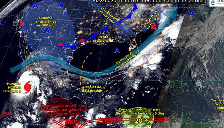 El huracán Norma, se localizará al oeste de las costas de Jalisco y Nayarit, con desplazamiento hacia Baja California Sur, sus extensas bandas nubosas producirán lluvias puntuales intensas en Baja California Sur, Sinaloa y Nayarit, lluvias muy fuertes en Jalisco, Colima y Michoacán, además de lluvias puntuales fuertes en Chihuahua y Durango.