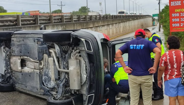 Playa del Carmen.- Conductor de una camioneta particular que bajaba en puente sobre la carretera federal 307 frente al poblado de Puerto Aventuras perdió el control al volante al ser chocado por otro vehículo y terminó volcado.