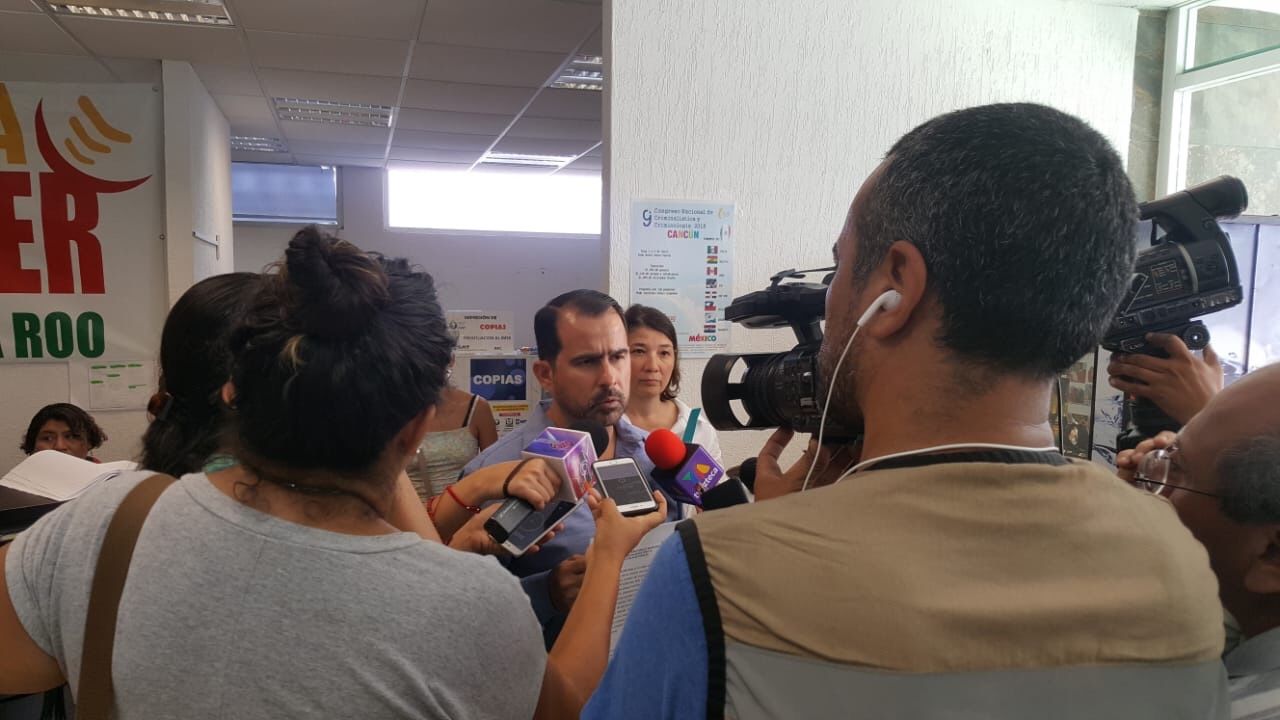 Playa del Carmen, Q. Roo, a 29 de junio 2018.- Jorge Aguilar Osorio, presidente del comité ejecutivo del PRD, denuncia una guerra sucia contra la candidata Cristina Torres, ya que es víctima de información falsa y dolosa en plena veda electoral.