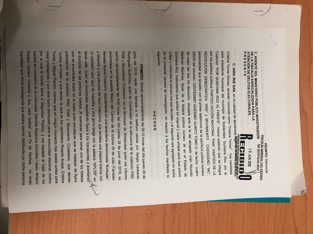 Luego de imponer una denuncia ante la Fiscalía Especializada en Delitos Electorales (Fepade) por la difusión de propaganda apócrifa contra la candidata a la presidencia municipal de Solidaridad, el líder estatal perredista dijo que en el marco de lo que establece la Ley Electoral y apegados a las características de los pronunciamientos que pueden realizarse a tan solo dos días de la elección, queremos denunciar una guerra sucia contra la candidata Cristina Torres, la cual ha sido orquestada principalmente a través de publicaciones con información falsa y de