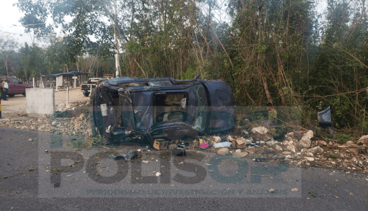 Cancún, a 19 abril de 2021.- El exceso de velocidad que lo que originó la tarde-noche de hoy una aparatosa volcadura de una camioneta de lujo en la carretera conocida como el Ramal, donde una persona resultó gravemente lesionada.
