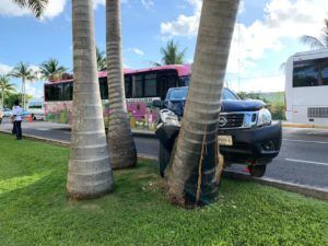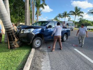Los hechos ocurrieron cuando la camioneta color negra NP300 perdió el control y chocó a un camión de turistas de Xcaret, pero la resistencia de la pesada unidad no sufrió daño, no así la otra unidad que terminó estampada en una palmera.