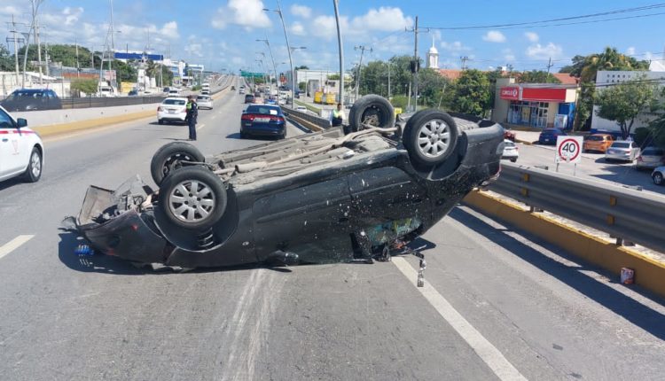 Playa del Carmen.- Aparatosa volcadura se registró sobre el puente del Boulevard Playa del Carmen en la mañana, solamente se registraron daños materiales y tráfico pesado en la zona.