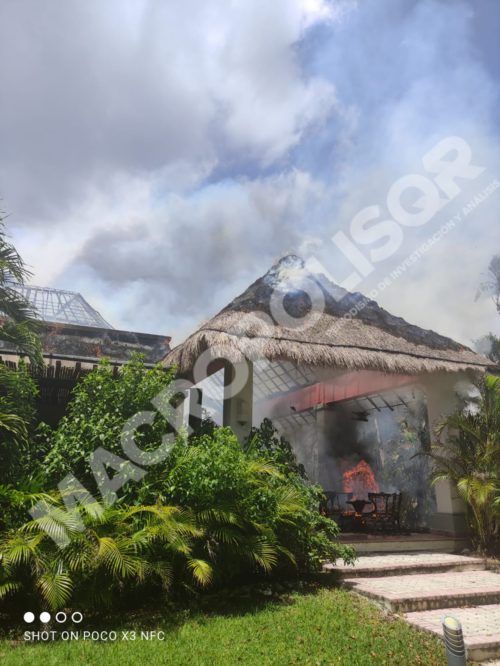 Puerto Aventuras, a 25 de mayo de 2021.- Al parecer al no funcionar el retardante contra incendios en madera y zacate, durante este martes el fuego consumió las enormes palapas de la lavandería y lobby del hotel Palladium Kantenah, ubicado en la carretera Puerto Aventuras-Tulum.