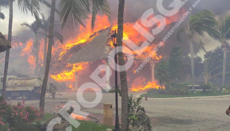 Puerto Aventuras, a 25 de mayo de 2021.- Al parecer al no funcionar el retardante contra incendios en madera y zacate, durante este martes el fuego consumió las enormes palapas de la lavandería y lobby del hotel Palladium Kantenah, ubicado en la carretera Puerto Aventuras-Tulum.