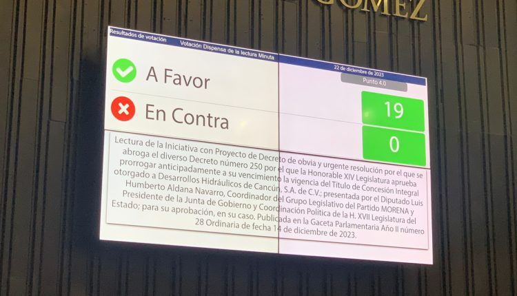 La iniciativa abroga el decreto 250 aprobado durante el Gobierno de Roberto Borge en la Décimo Cuarta legislatura, donde se prorrogaba el vencimiento de la vigencia del título de concesión integral a Desarrollos Hidráulicos de Cancún SA de CV hasta el 31 de diciembre de 2053.