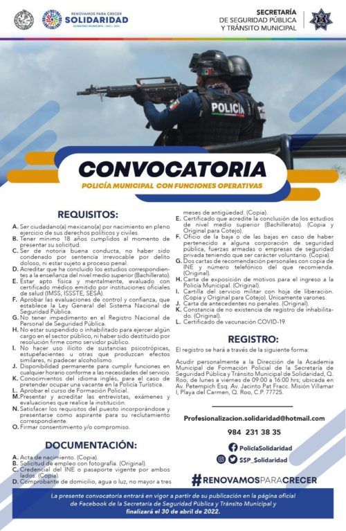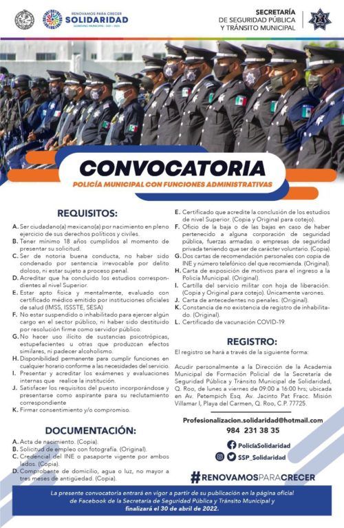 Como parte de una estrategia integral para el fortalecimiento de la seguridad y la construcción de la paz en Solidaridad, inicia la convocatoria para la contratación de policías municipales.