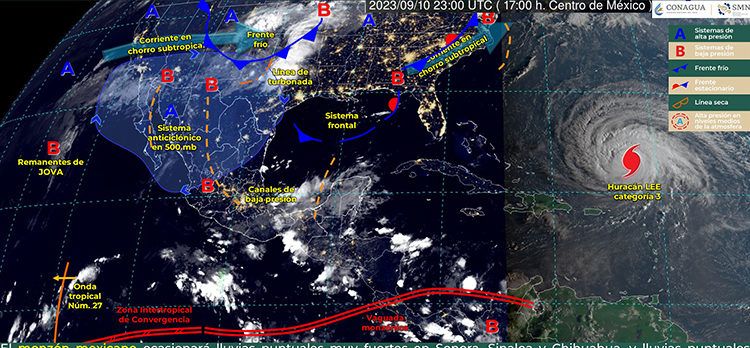 Canales de baja presión en interacción con inestabilidad en niveles altos de la atmósfera sobre el sureste de México y el ingreso de humedad proveniente de ambos océanos, producirán lluvias puntuales fuertes en Nayarit, sur de ambos litorales y Campeche; chubascos en Jalisco, Colima, Michoacán y Estado de México, así como lluvias aisladas en Tlaxcala, Morelos y la Ciudad de México.
