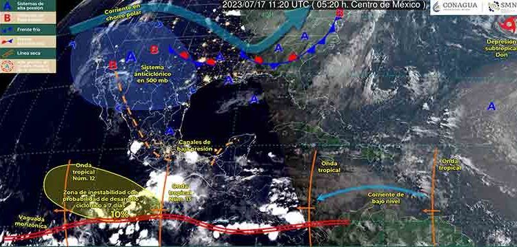 Playa del Carmen, 17 de julio del 2023 (Macropolis QR).- Un canal de baja presión en el sureste mexicano y la Península de Yucatán, en combinación con el ingreso de humedad del Golfo de México y Mar Caribe, provocarán lluvias puntuales muy fuertes en Oaxaca, Veracruz y Chiapas, lluvias puntuales fuertes en Campeche; e intervalos de chubascos en Tabasco, Yucatán y Quintana Roo.
