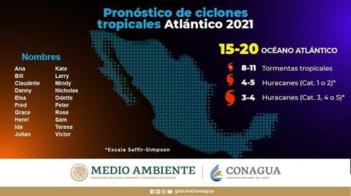 Para este 2021 se pronostica que serán entre 15 y 20 fenómenos: 8-11 tormentas tropicales, 4-5 huracanes categoría 1-2, y 3-4 categoría 3, 4 y 5 en la escala Saffir Simpson.