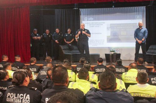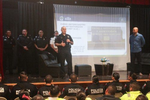 Playa del Carmen.- En cumplimiento a la estrategia de fortalecimiento de seguridad que impulsa la presidenta municipal de Solidaridad Lili Campos, los policías reciben un curso especializado en Antiextorsión y Antisecuestro, que enseña y actualiza sus conocimientos para prevenir, dar respuesta, investigar y actuar contra estos delitos.