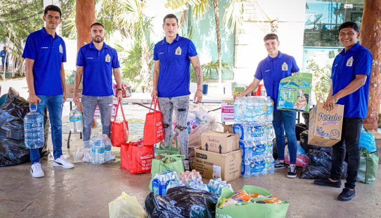 Los jugadores Daniel Jiménez, Sergio Meza, Pablo Guzmán y Andrés Pérez junto con directivos fueron quienes hicieron la entrega al Centro de Acopio instalado en la palapa del DIF Solidaridad de paquetes de agua embotellada; bolsas de sopa de pasta, arroz, frijol; latas de atún; aceite vegetal comestible; galletas saladas; papel higiénico, entre otros.