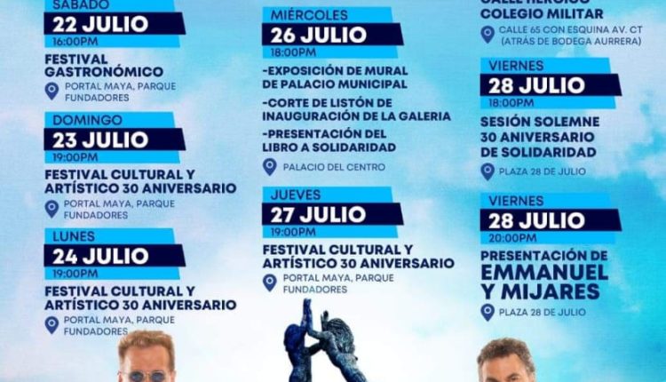 Playa del Carmen, 23 de julio del 2023 (Macropolis QR).- En el marco de los festejos por el 30 aniversario de Solidaridad, el gobierno municipal que encabeza Lili Campos invita a las y los solidarenses a los eventos que se realizan durante la semana, en el Portal Maya, entre otros escenarios.