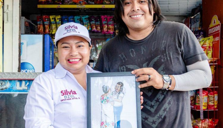 Playa del Carmen.- Como parte del respaldo juvenil a su proyecto, la candidata de Morena a la diputación del D9, Silvia Dzul Sánchez, recibió del artista plástico Rey David Morales un diseño artístico en reconocimiento a su campaña a “ras de suelo” que el día de hoy cumple 31 días de incansable actividad.