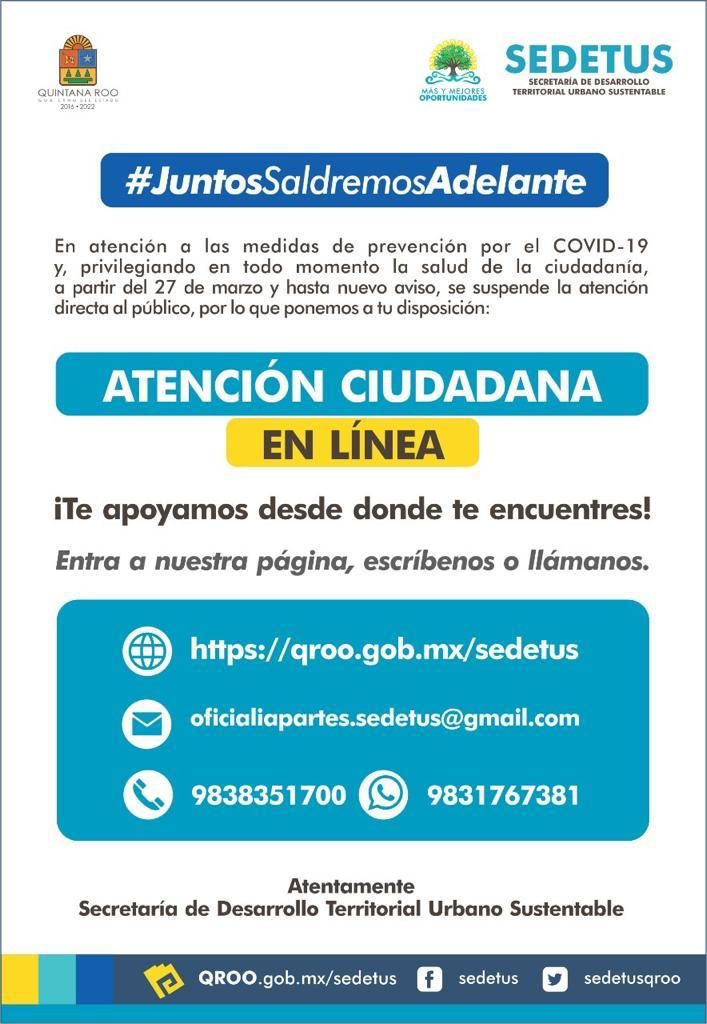 Chetumal, Quintana Roo, 1 de abrir de 2020.- Los servicios de la Secretaría de Desarrollo Territorial Urbano Sustentable (SEDETUS) no se detienen y, en estricto apego a la disposición del sano distanciamiento social para prevenir el contagio del coronavirus (Covid-19), abre un acceso de comunicación vía internet, correo electrónico y telefónica a fin de atender y dar seguimiento a los trámites que la ciudadanía requiera realizar.