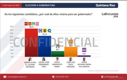 Según el sondeo publicado el pasado 11 de marzo de 2022, María Elena Hermelinda Lezama Espinosa se ubicó en el 35.6 de las preferencias, mientras que Laura Lynn Fernández Piña obtuvo 23.2 por ciento, es decir 12.4 por ciento.