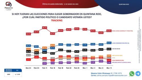 Entre tanto, la empresa Lassive Caller en su ejercicio de medición de opinión pública planteó la pregunta “si hoy fueran las elecciones para elegir gobernador en Quintana Roo ¿por cuál partido político o candidato votaría usted? el resultado muestra de igual manera una tendencia creciente a favor de Laura Lynn Fernández Piña.